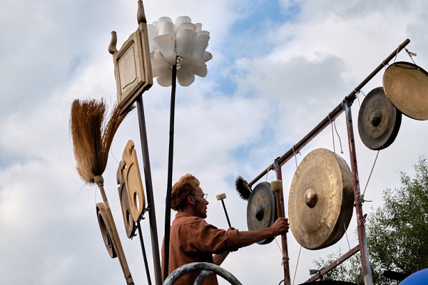 Des chaises, comme icône du festival, assemblées en totems déséquilibrés en points de repères et portes d'entrée.