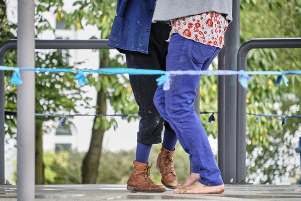 Des figures d'acrobates surgissent des affiches de cirque de la fin du XIXe siècle, des silhouettes en noir et blanc cherchent l'équilibre dans le parc, les arbres, sur des structures composées.